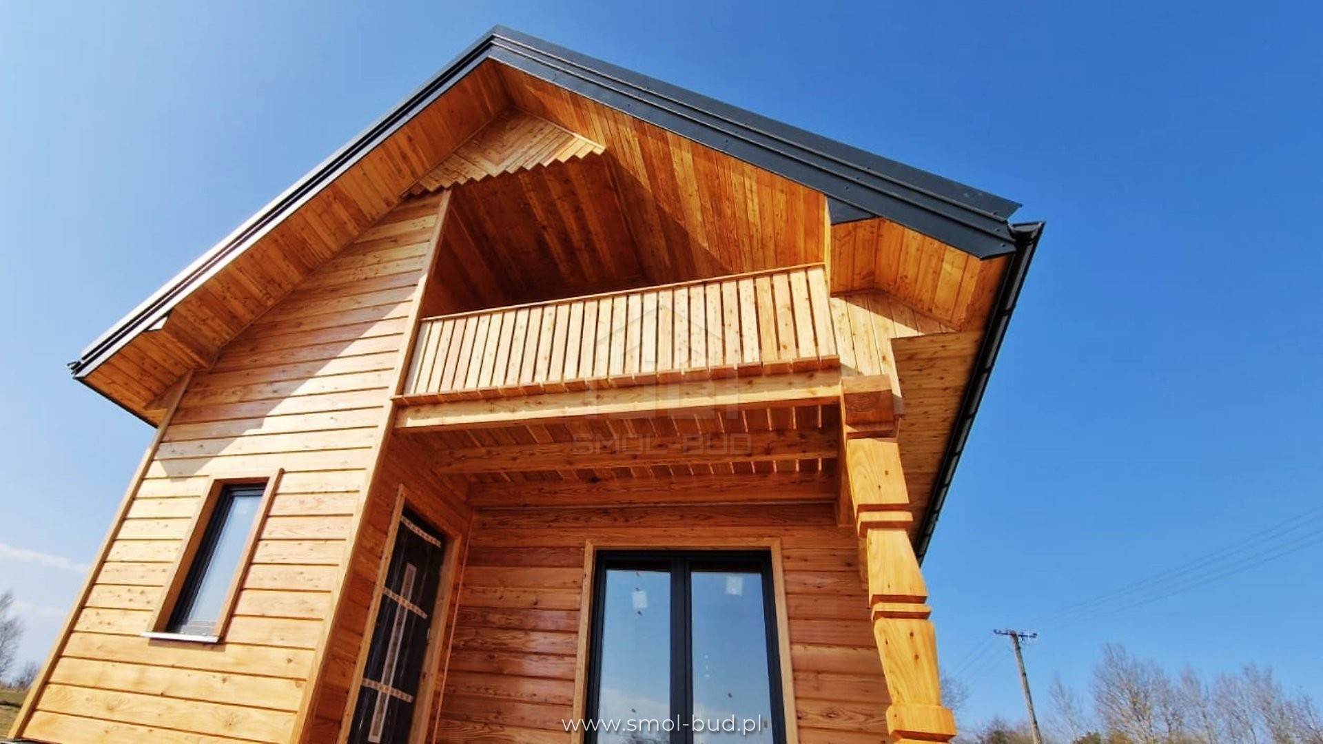 Na poddaszu przewidziano dwie sypialnie oraz garderobę. Taki układ sprawia, że dom może pełnić funkcję zarówno całorocznego miejsca do życia, jak i komfortowego domku rekreacyjnego. Uzupełnieniem bryły jest niewielki balkon, który dodaje całości uroku i podkreśla charakter budynku.